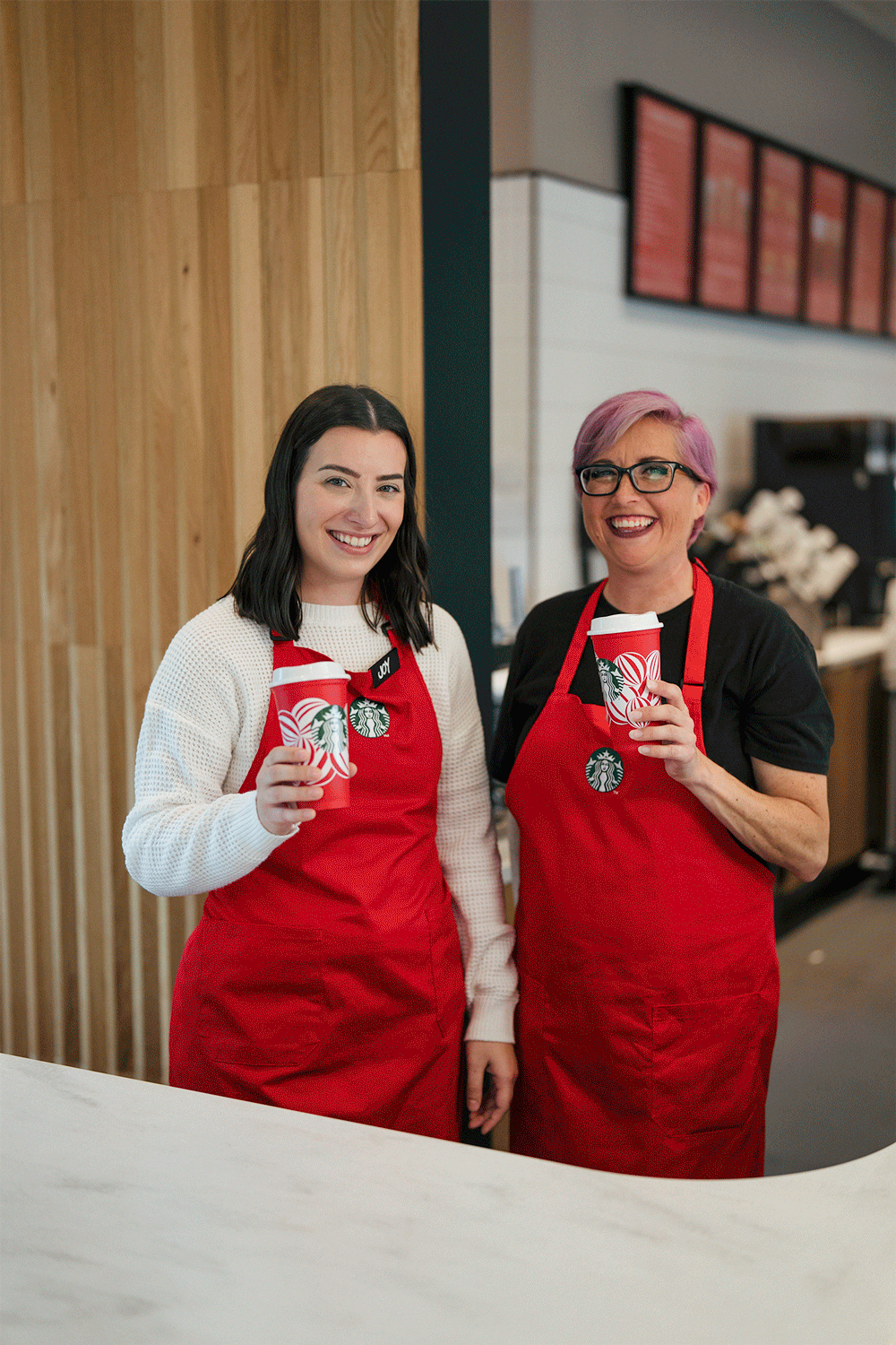 A gif of two Starbucks barista wearing red apron and holding a red reusable cup and cheering together