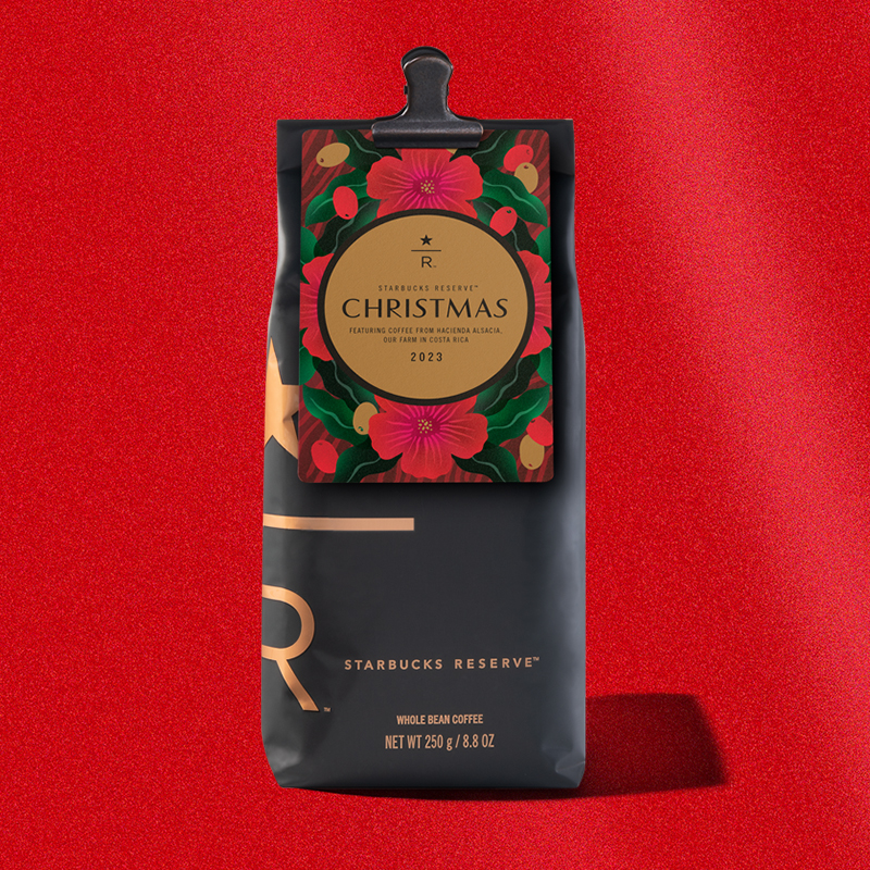 Starbucks Reserve® Christmas 2023 is a vibrant, modern expression of the holiday, with savory spice notes and a bright sweetness. This year’s Starbucks Reserve® Christmas brings you a blend of three remarkable coffees: Hacienda Alsacia® from Starbucks farm in Costa Rica, joins rare aged Sumatra and coffee from the Aceh region of Indonesia to create a savory spice and sweet brightness for the holidays. It features notes of lemon zest, maple and candied ginger.